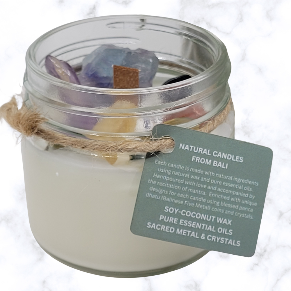 Elle est décorée sur son dessus avec des pierres semi-précieuses et une pièce chinoise pour la chance. (Les pierres peuvent différer d'une bougie à l'autre).