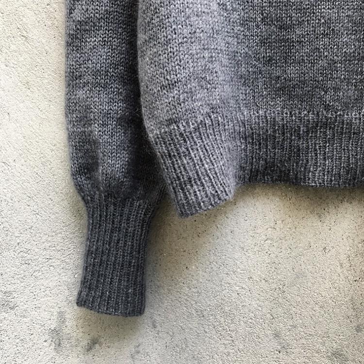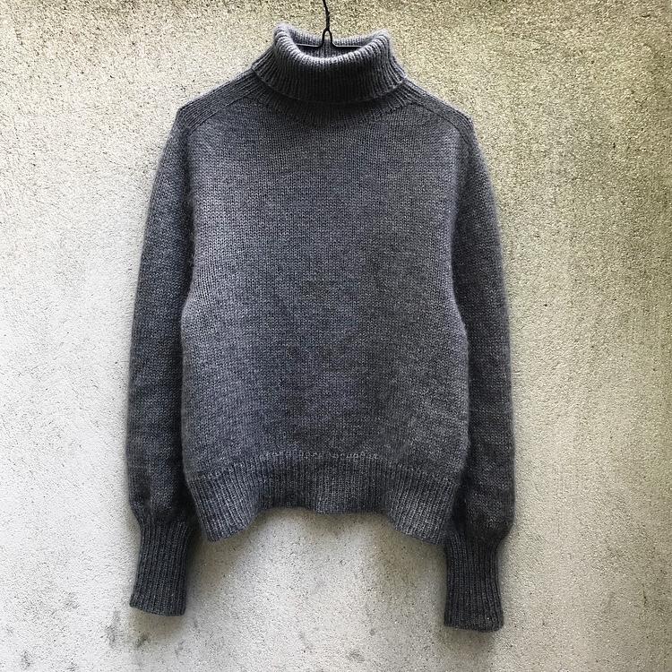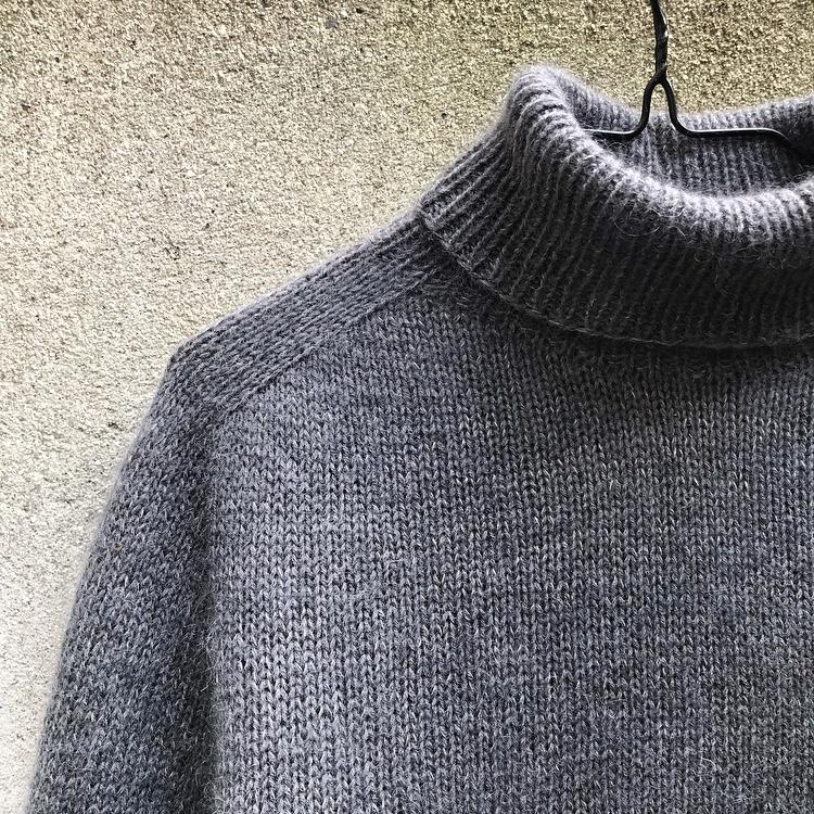 Ce pull est tricoté en rond et sans couture de l’encolure vers la bas en point de jersey. Les bordures et le col roulé sont tricotés en côtes 1/1. Ce pull a une construction élégante avec la ligne des épaules soulignée, une encolure façonnée en rangs raccourcis et des manches légèrement ballon.
