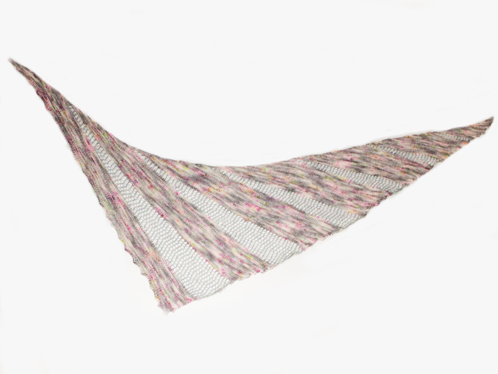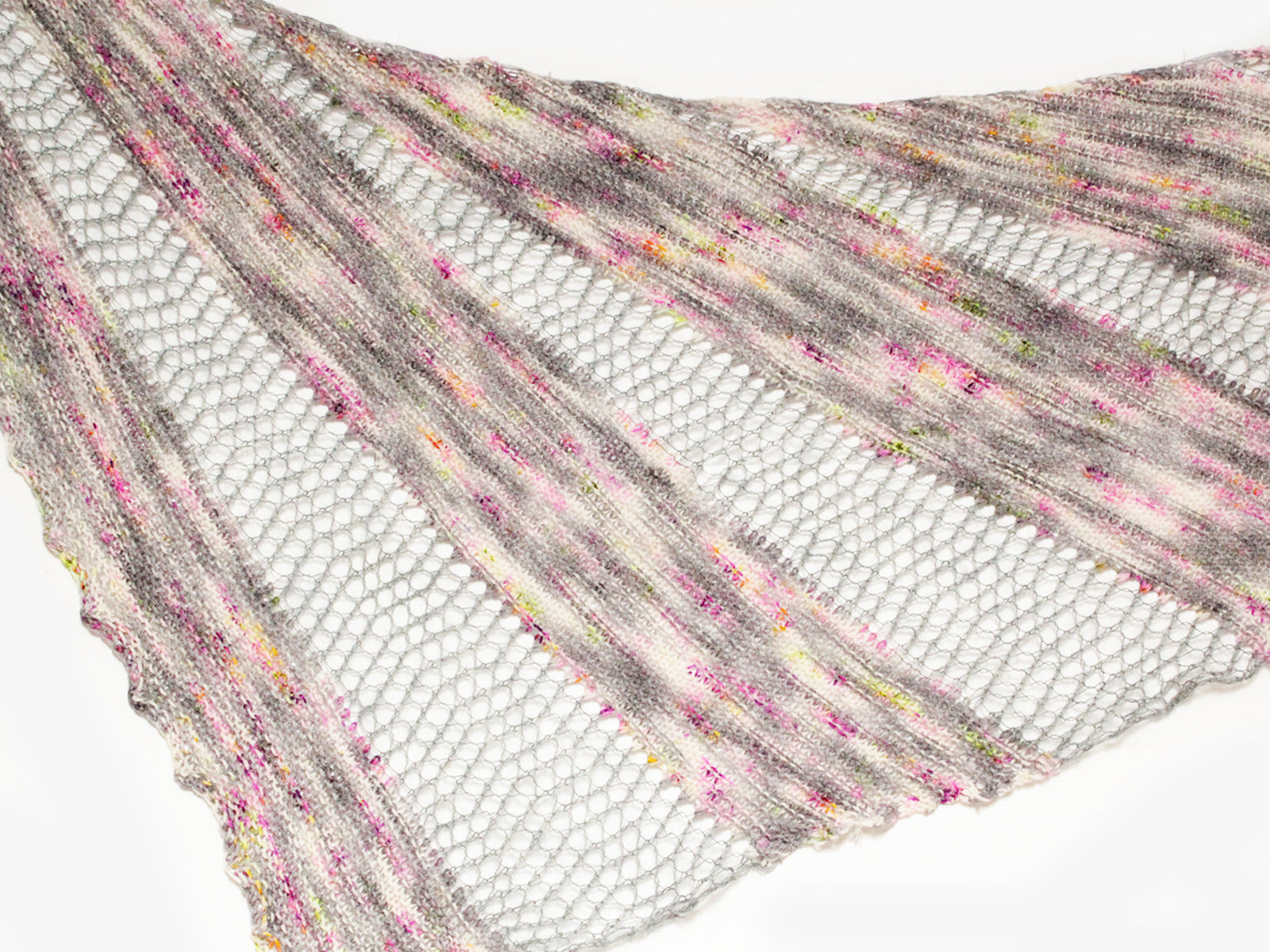 La forme triangulaire des sections Hyde est obtenue grâce à des rangs raccourcis. Pour ce faire, au lieu de tricoter le rang au complet, on s'arrête avant la fin, on retourne le tricot et on repart dans l'autre sens. Il n'est pas nécessaire de faire autre chose que de tourner le tricot; ça va créer un petit trou, mais dans la dentelle, ça ne se verra pas beaucoup. Au rang endroit suivant, il sera inscrit, par exemple, de tricoter jusqu'à 9 mailles du dernier rang raccourci, c'est à dire de l'endroit où on a tourné le tricot au rang précédent. S'il vous est difficile de le distinguer, vous pouvez mettre un marqueur à cet endroit avant de commencer à tricoter dans l'autre sens.