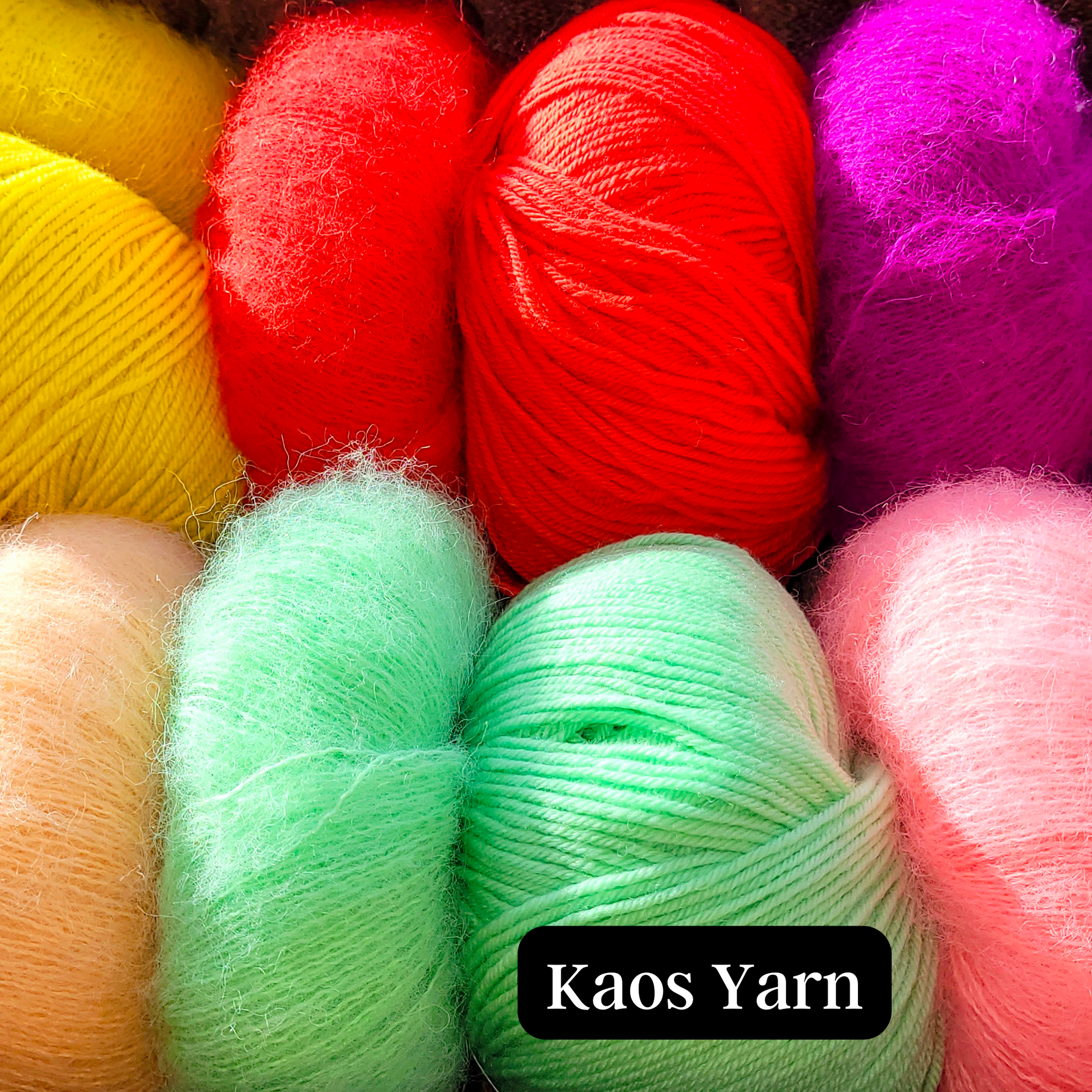 - Duo en Kaos (Fil tricoté en double) : Alpaga brossé (5 pelotes) + mérinos : (5 pelotes) = 152,5 $
