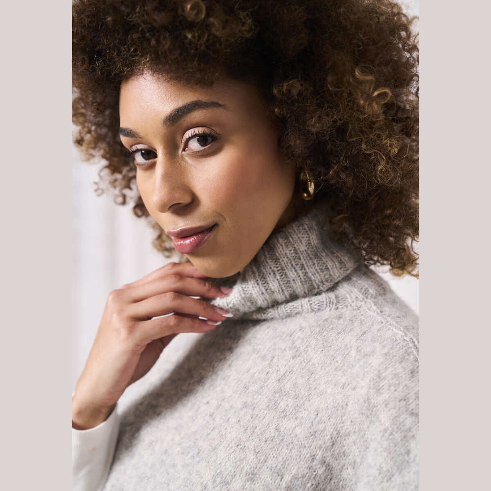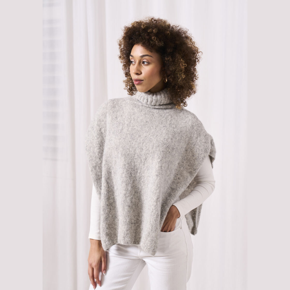 "Le poncho Lana offre une solution rapide et confortable pour se réchauffer. Cet accessoire polyvalent est idéal pour les superpositions et présente des éléments distinctifs tels que des côtés fendus, un col roulé côtelé et un corps en point de bas accentué par des bordures en point de mousse. Tricoté en coton alpaga, il allie confort et style en toute transparence."