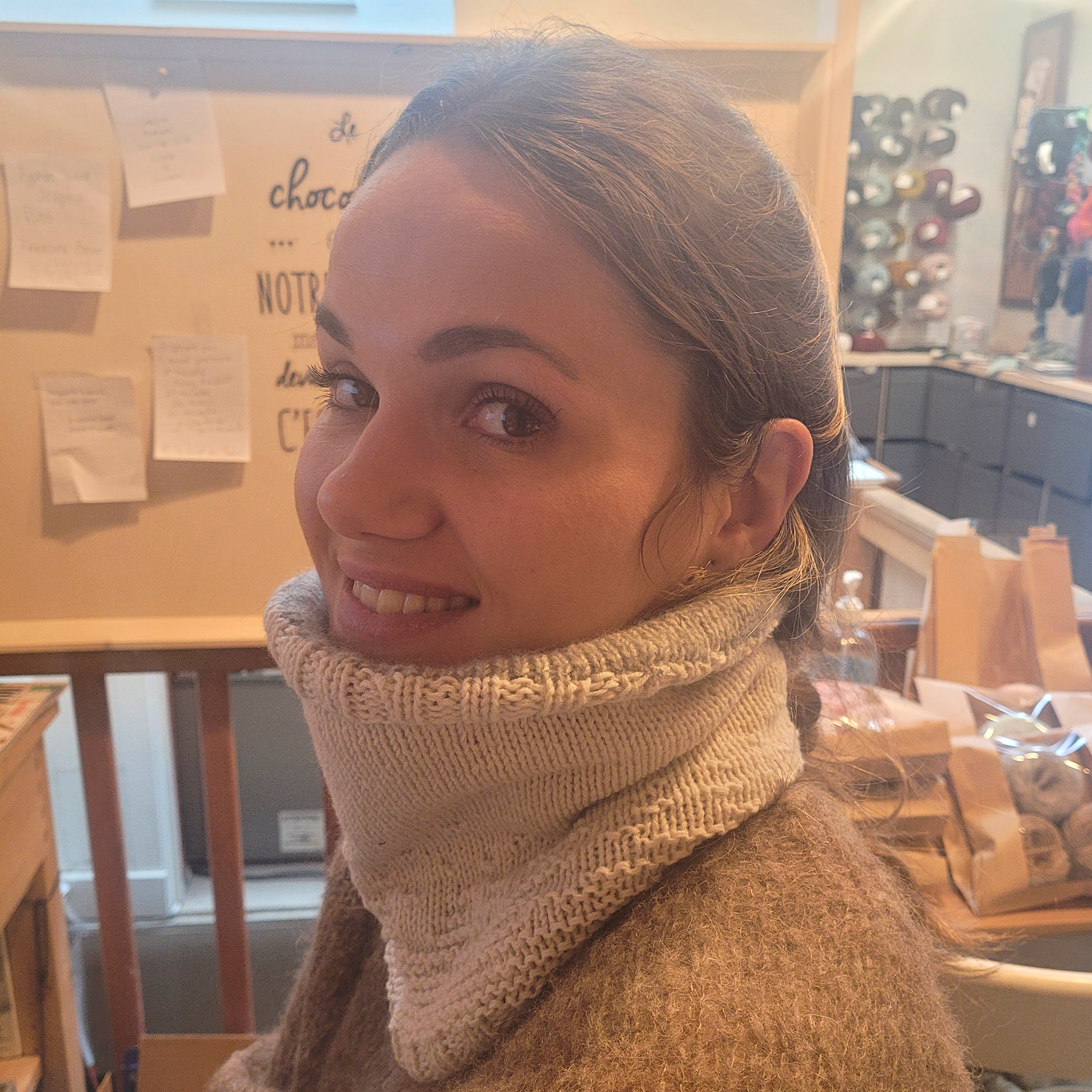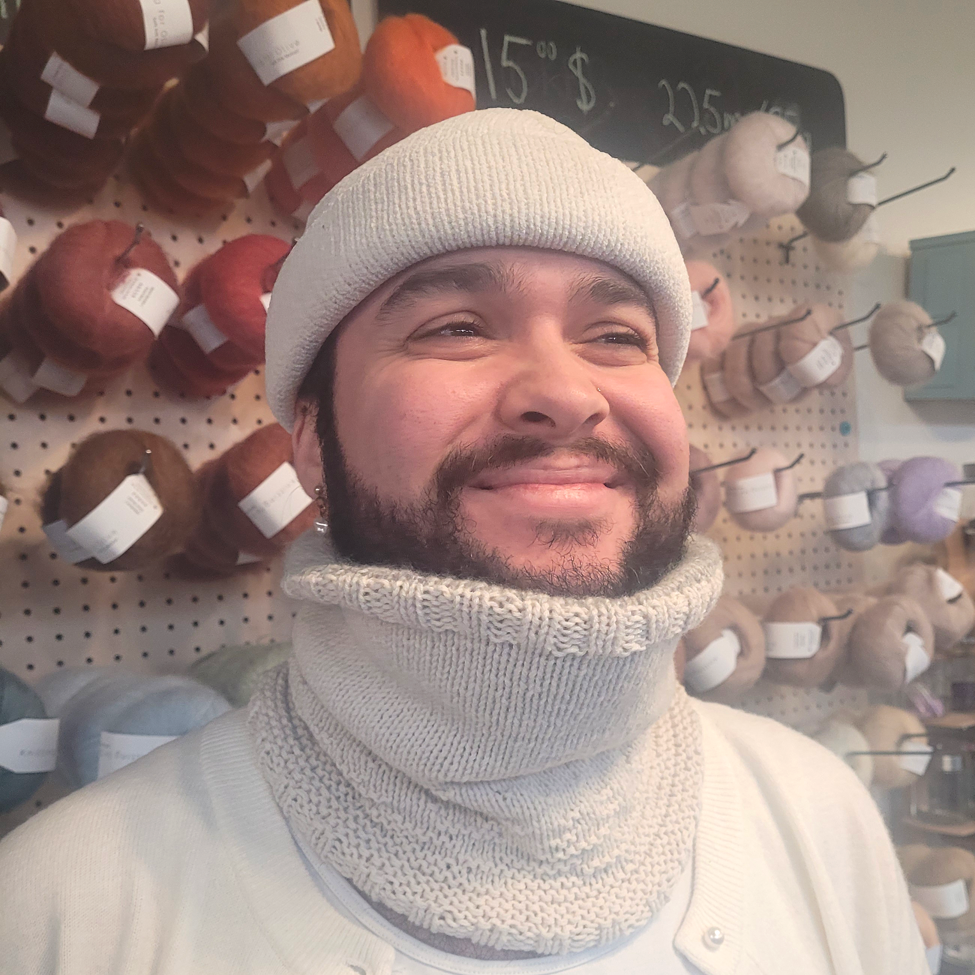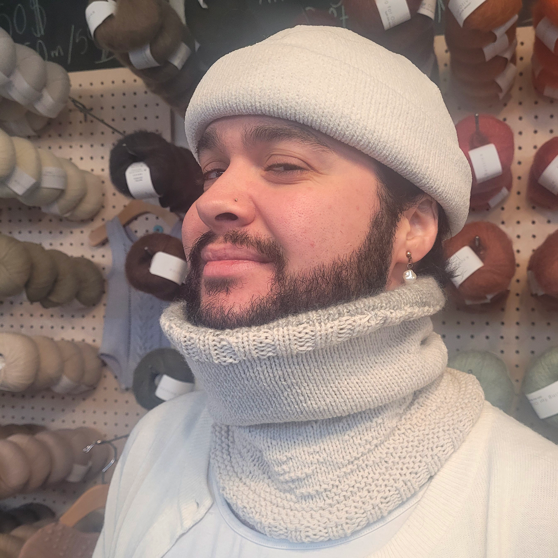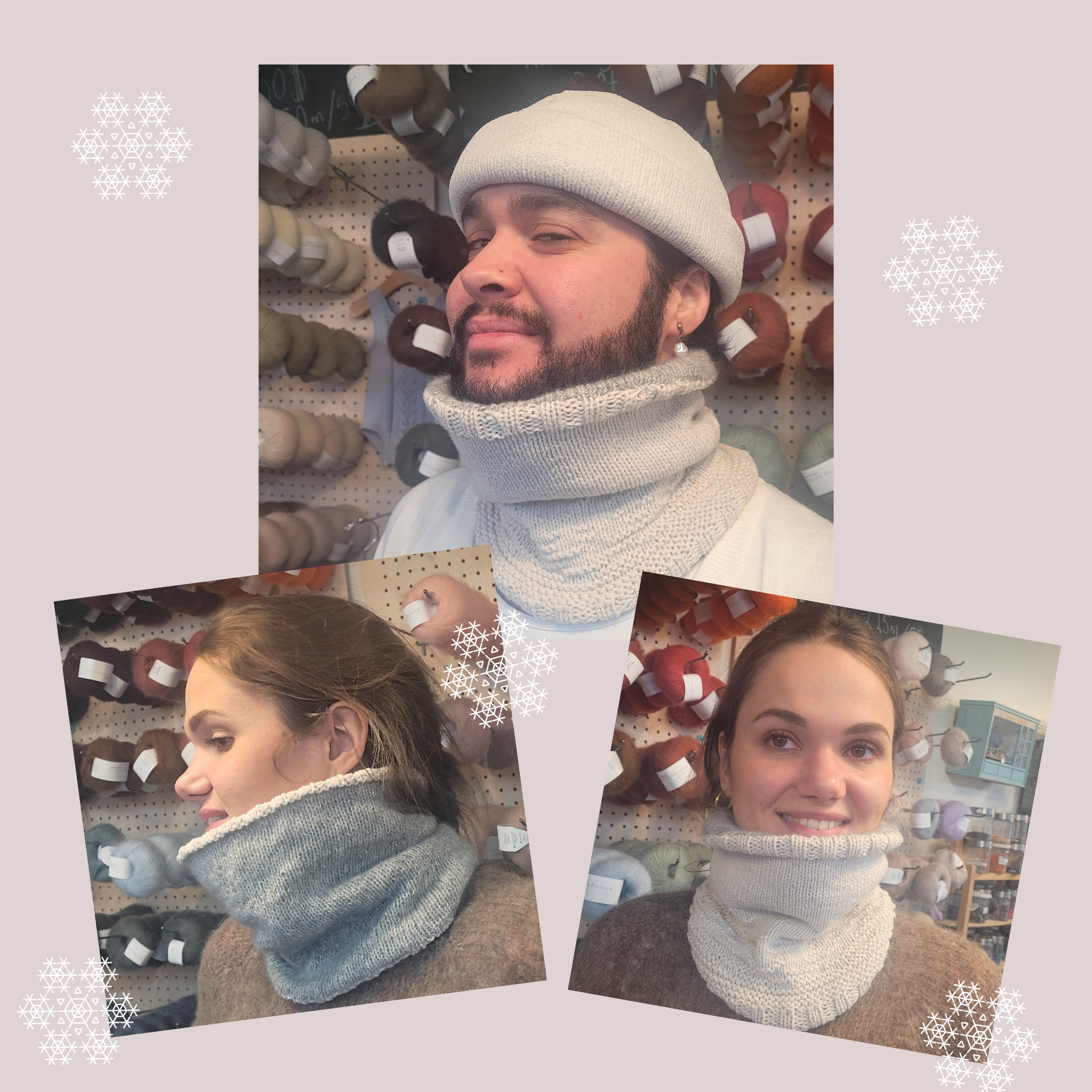 Inspiré par le spectacle de la première neige à Montréal, ce petit col a un motif de mailles endroits et envers qui "floconne". L'intérieur est tricoté dans une laine plus douce qu'un nuage, la Feli d'Illimani (70 % Laine mérinos ultra fine, 30 % Cachemire)
