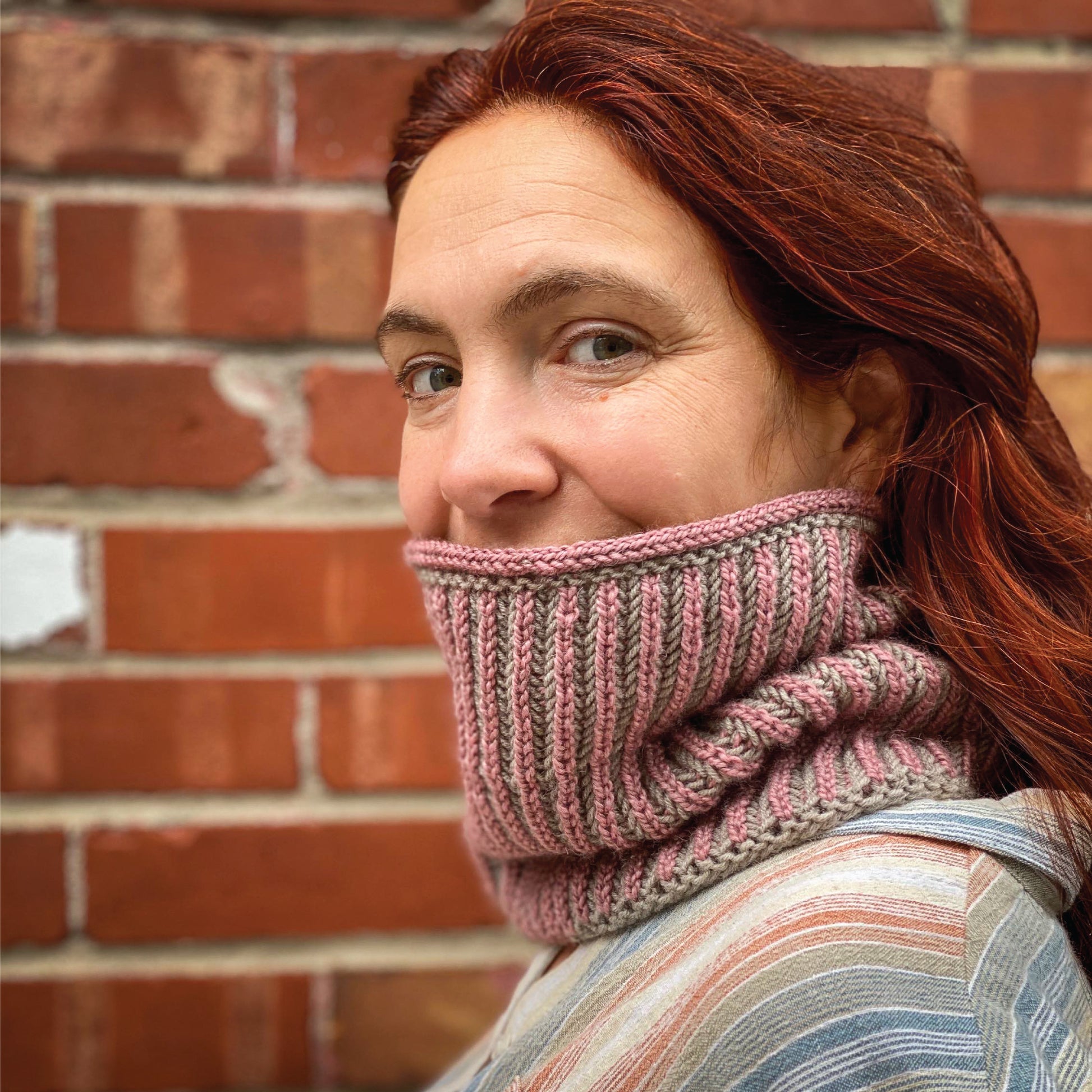 100 g de laine grosseure léger (DK). Patron fait avec un (1) écheveau de la Santi, merino/alpaga/yak/soie, léger (DK), écheveau de 50 g/ 125m, colori Evening Bloom de Illimani Yarn et un (1) écheveau de Nomad, merino/yak, léger (dk) en écheveau de 100 g/211 m colori Naturel de Fleece Artist