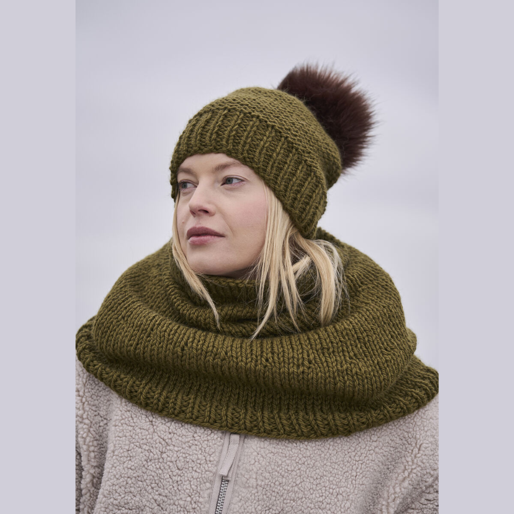" Faciles à porter, le snood Salle et le bonnet Highoak, tous deux tricotés avec de la laine Chunky, forment une paire parfaite !