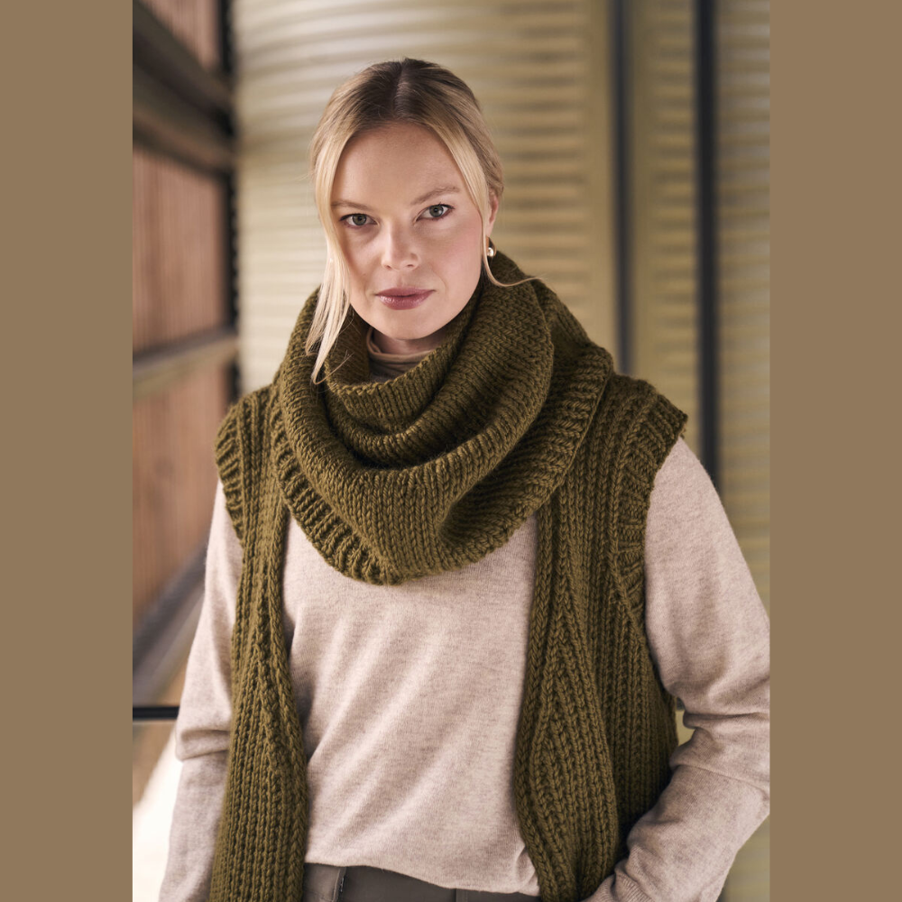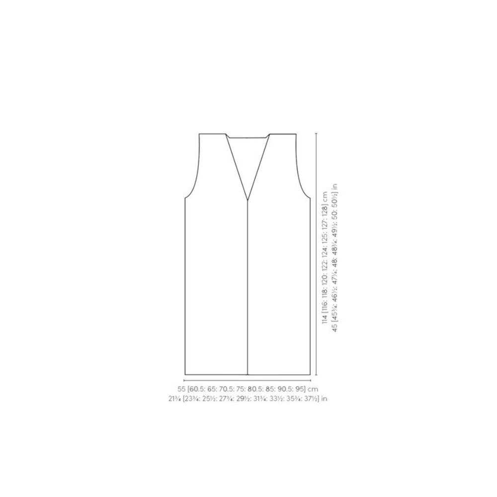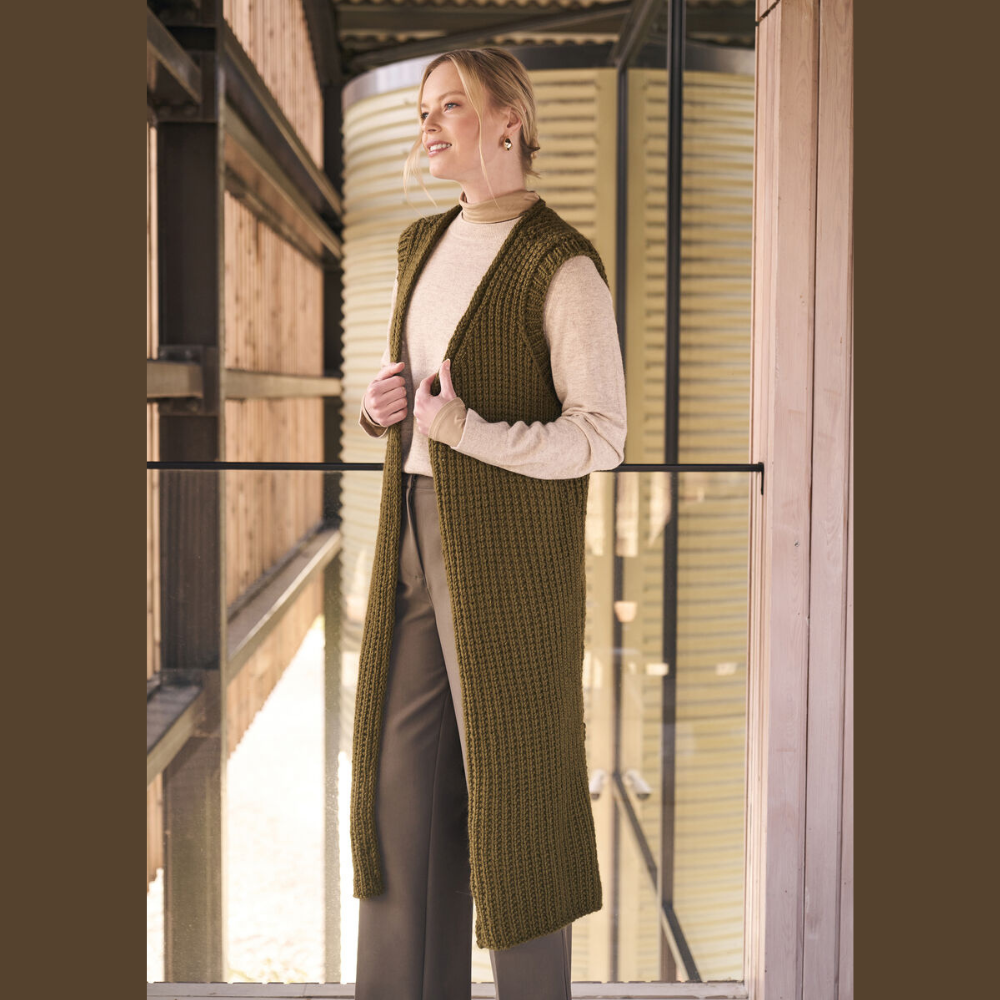 "Southwold est un long gilet tricoté en Chunky Wool. Il s'agit d'une pièce essentielle à superposer. Il est tricoté dans un point de côtes brisées, avec un col en V et des emmanchures profondes, ce qui permet de le porter par-dessus des couches. Il s'associe parfaitement au snood Salle pour compléter le look."