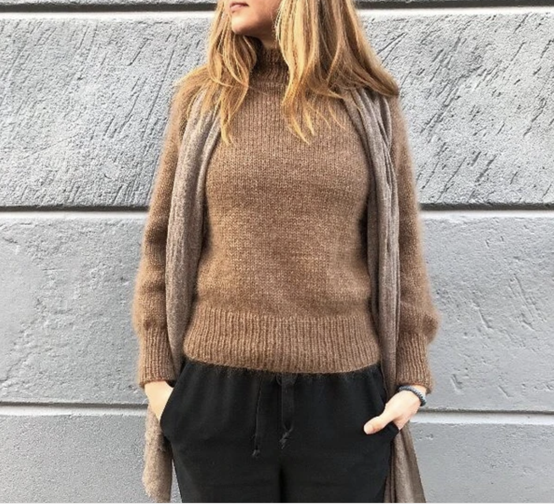 The sample is in size S in Soft Silk Mohair, Hazel colorway, and Merino, Soft Cognac colorway